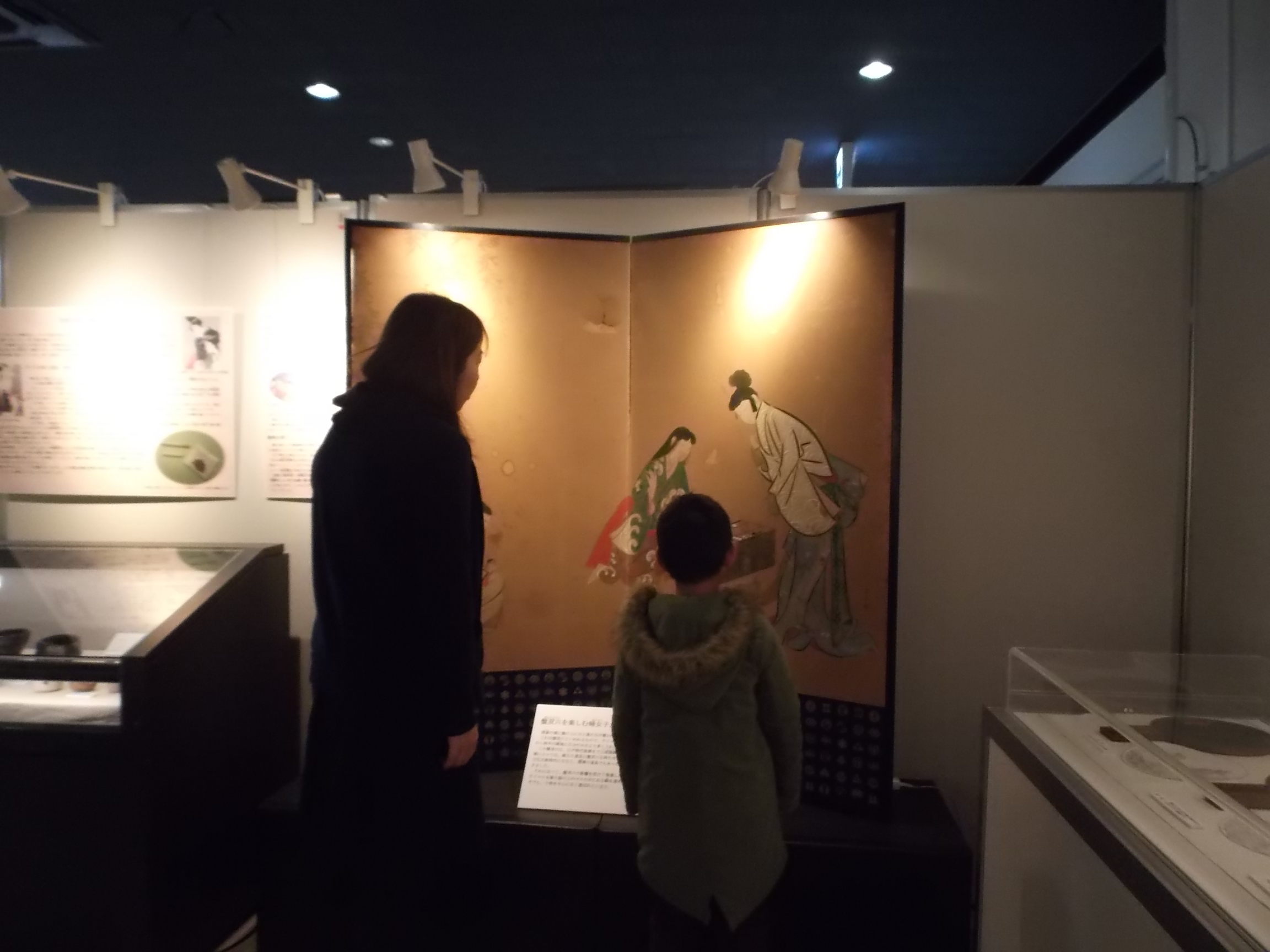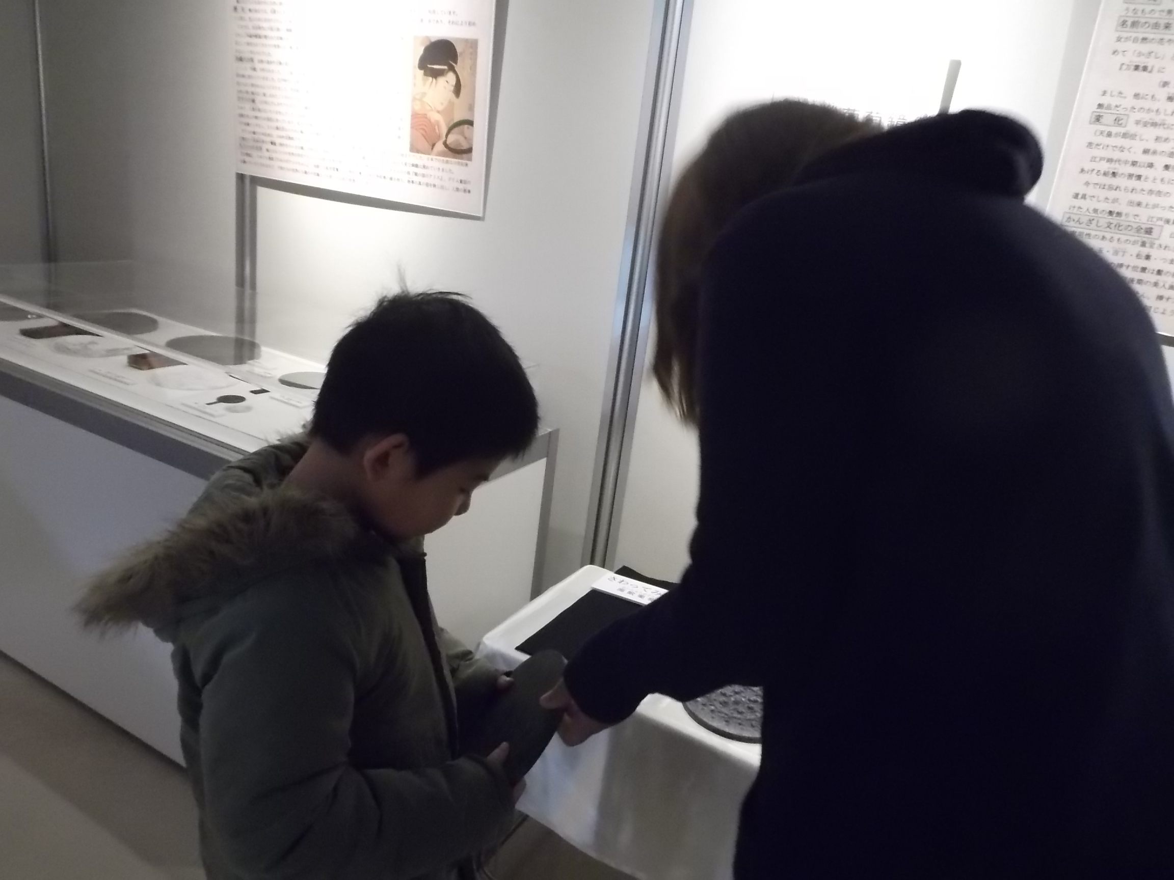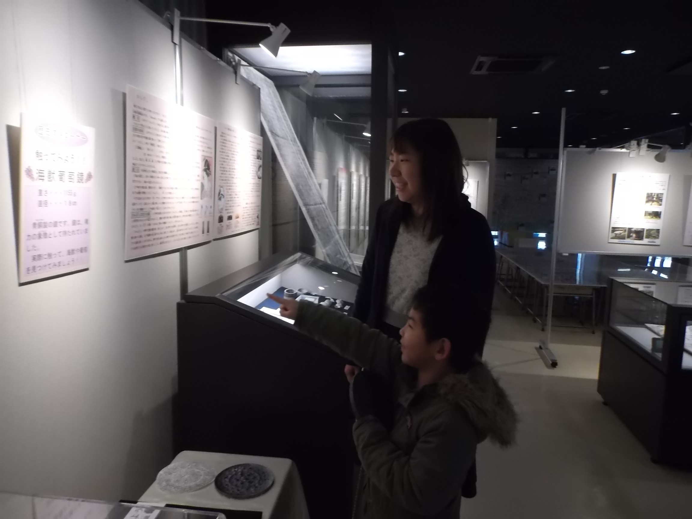 8世紀ごろに盛んに制作されていたとされる「海獣葡萄鏡」。実際に手に取ってその重さを感じたり、鏡についている海獣をまじかに見てみたり・・・「想像より重いね!!」「なんだか、海獣がカエルみたい!!」など親子での会話もよく聞こえます。その隣にある「双六で遊ぶ絵の屏風」の前では、「これ、双六?!」「今年のお正月は、僕も双六したい!!」など、子供さんも熱心に史料を見てくれていました。