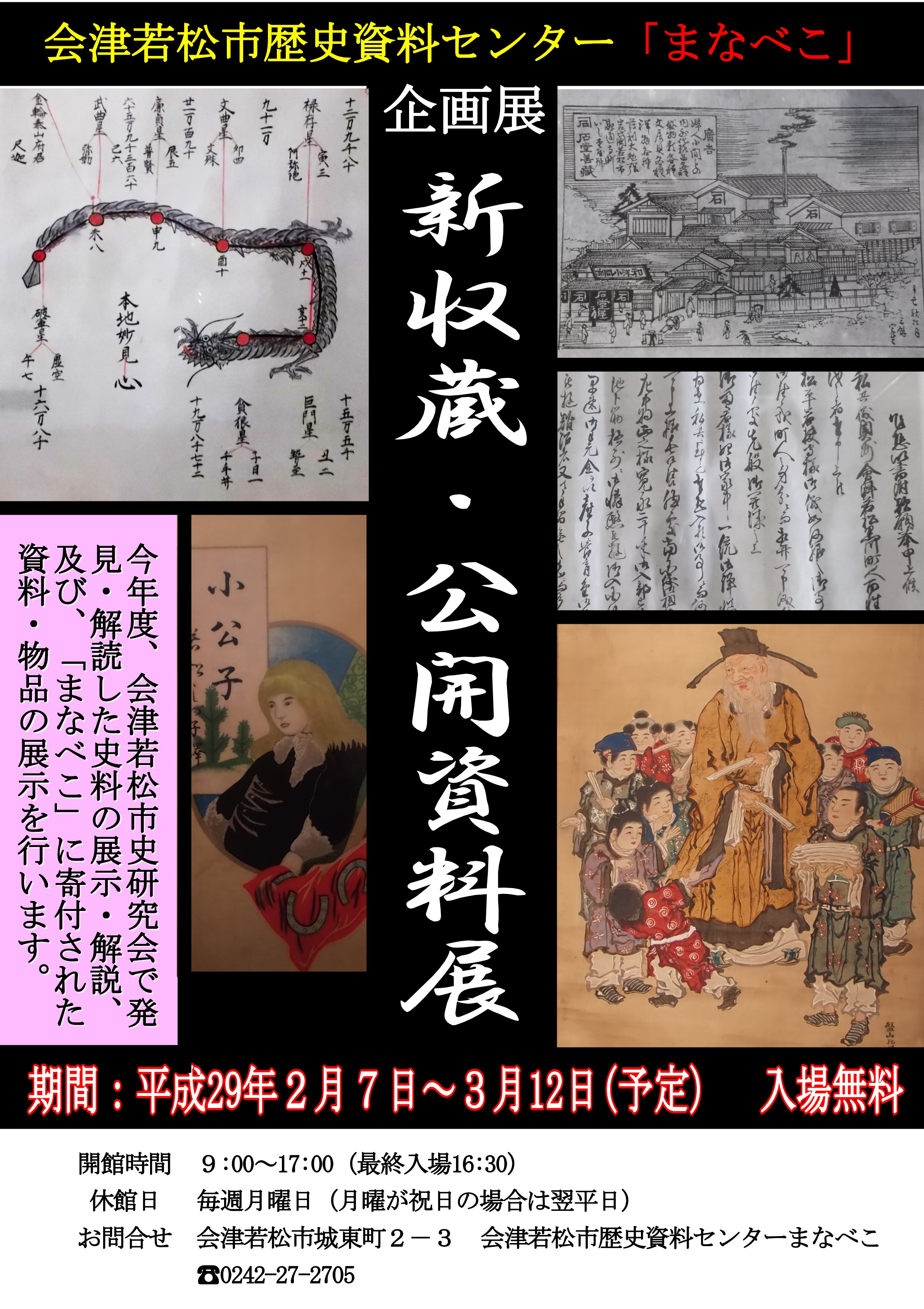 2月7日より、歴史資料センター「まなべこ」企画展示室にて、企画展「新収蔵・公開資料展」を開催します。今回の企画展では、今年度、会津若松市史研究会で発見・解読した史料の展示・解説を通して、当会の活動やその意義を皆さんに知って頂くことを目的としています。
