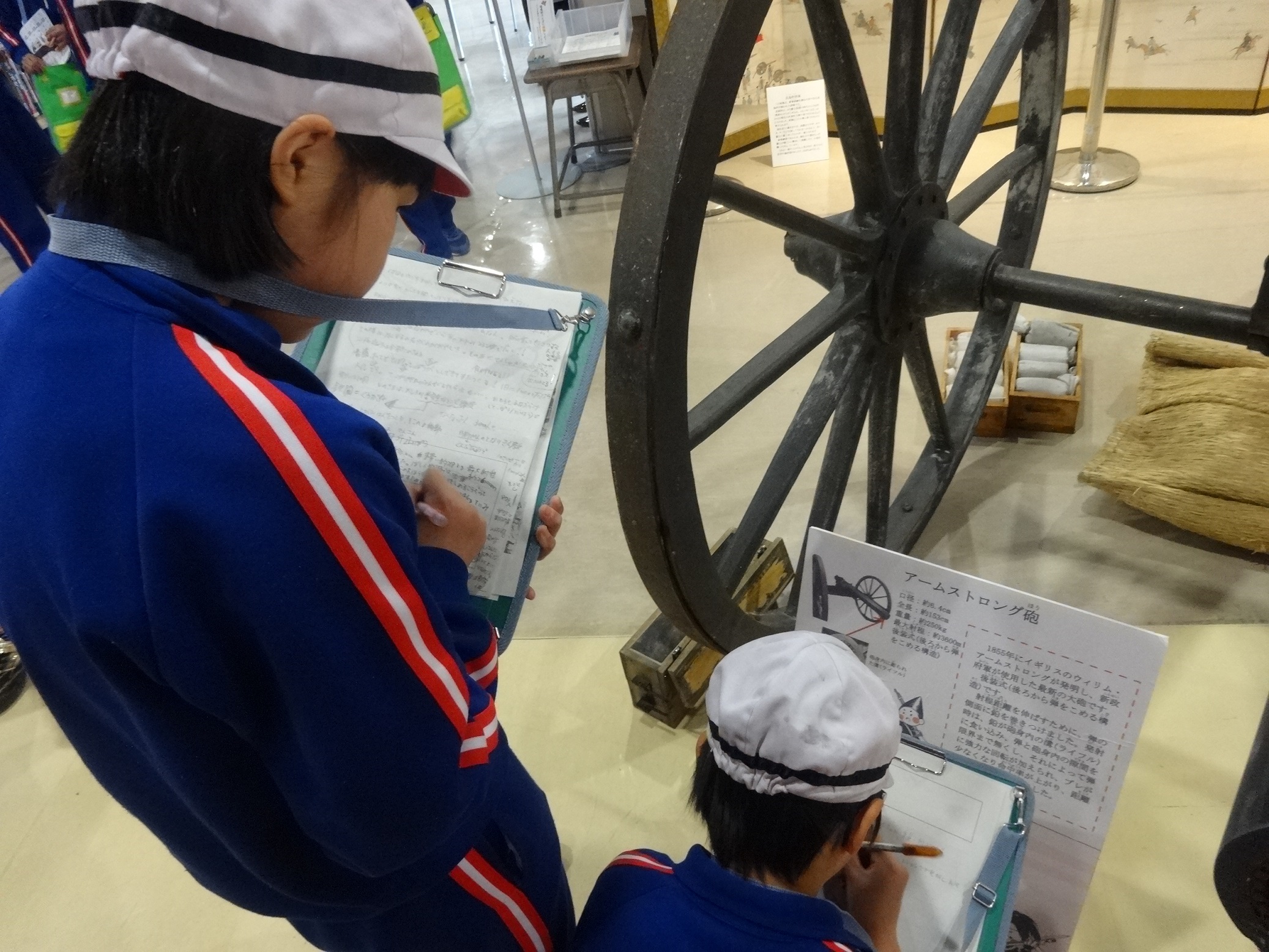 お話を聞いたあとに見る大砲や鉄砲のレプリカに、皆さんは大変興奮している様子で、「大砲って、こんなに大きいの?」、「これ、どうやって撃つの?」、「どこに弾を入れるの?」などなど・・・次から次へと質問が飛び、興味でいっぱいでした!!