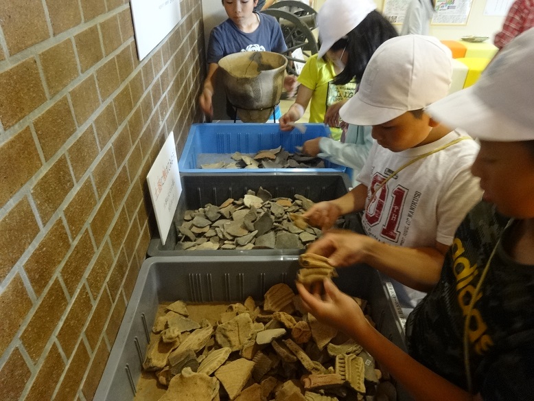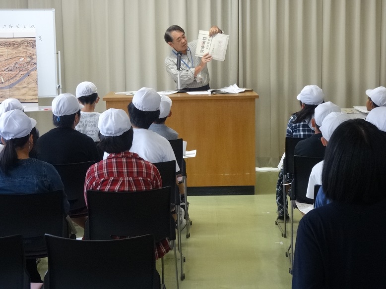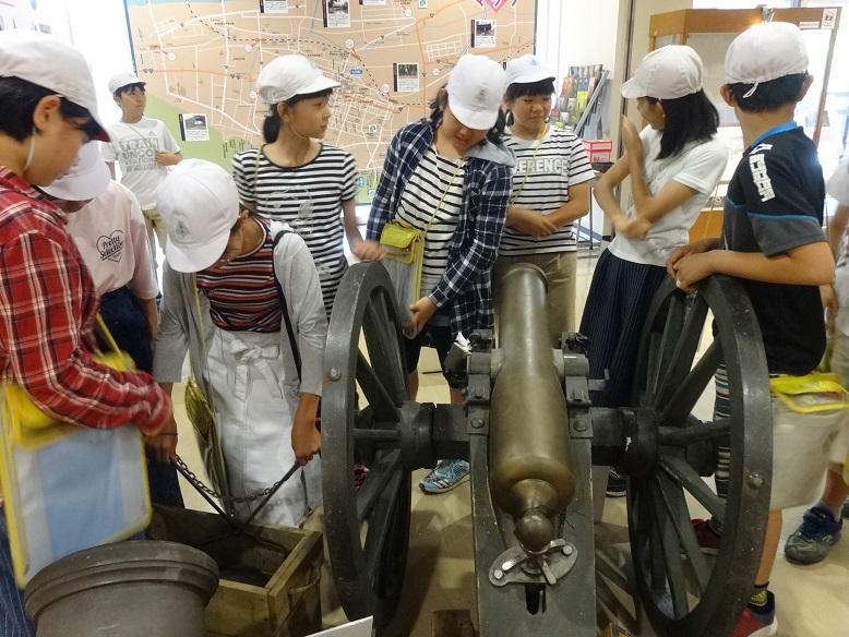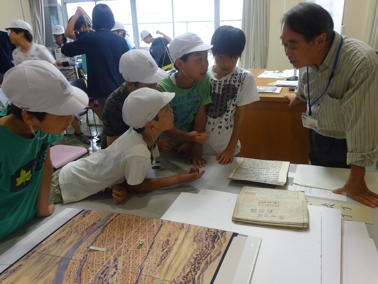 前半の講師の解説では、城下絵図をみながら当時の町の様子や日新館の生徒たちの生活を聞き、興味深げにメモをとっていました。また日新館で使われていた実際の貴重な教科書が披露され、「これを10歳くらいの生徒が読んでいました。」との解説に、児童の皆さんから「え~!!」っという驚きの声があがりました。教科書の中は、上から下まで難しい漢字がビッシリ!!日新館の生徒たちも、皆さんと同じように日々精進していたんですね。今回の「まなべこ」ツアーをきっかけに、会津の歴史や文化に興味をもって頂ければ、私たちスタッフも嬉しく思います。またのご来館をお待ちしております。