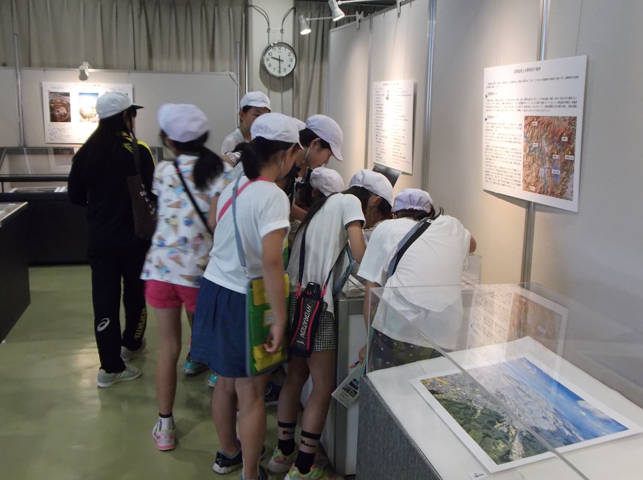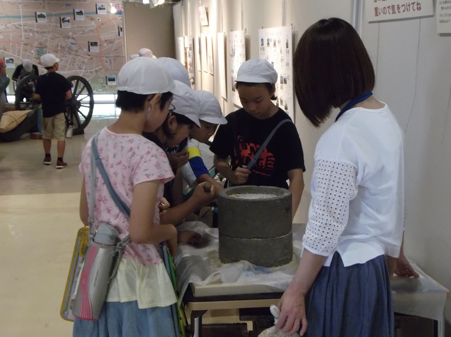 体験コーナーは、時代ごとに並べた土器を触り比べたり、石臼を回し自分で挽いたきなこに感激したりと、とても楽しそうでした。